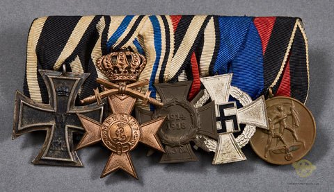 German WWII Five Medal Bar-I always find these long medal bars very interesting, as they all tell a story of the soldier's career. This one tells its own story. The first medal is the 1914 Iron Cross 2ndclass, that is starting to show its age. The finish on this one is good, as is the toned silver frame. The second medal is the Bavarian Military Merit Cross 3rdClass w/Swords. This would be a decoration for bravery and military merit for enlisted men, and low ranking officials. The cross swords indicate a wartime issue, awarded for distinguished service during combat. The next medal is the cross of honor with swords. The next medal is the 25 year faithful service award. This was awarded for 25 years of service to the party. This fellow then went on to win the Czech Annexation award. It features a matte bronze finished round medal and the obverse depicts ethnic German breaking the chains of bondage carrying the flag of national socialism. The reverse has the script 'Ein Volk, Ein Reich, Ein Führer' around the edge and '1 Oktober 1938' in the center. This medal has very good details. This was of course awarded for the annexation of Czechoslovakia. The medals are all in very good condition. The correct ribbons are showing their age with some discoloration but overall retain their colors quite well. The backing is a black felt, and the long pin functions as it should. Overall, a handsome set.