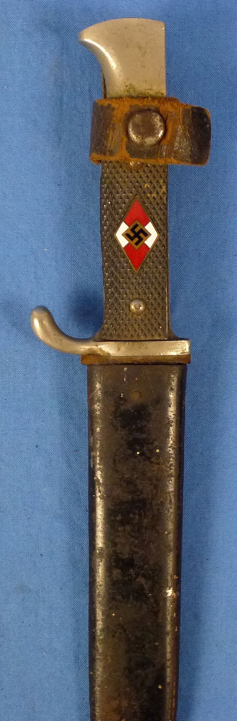 The blade shows spots, scratches, and surface grime. The blade bears the RZM code of M7/ 85, reflecting production by the firm of Arthur Evertz of Solingen. The leather washer is in place at the top of the glade. The guard and the pommel both exhibit wear to the plated finish. The black Bakelite grip plates are without chips or cracks while showing dirt and grime. The enamel Hitler Youth diamond is set firmly into the grip and it is also without chips or damage. The scabbard has wear to the paint as well as some spots of rust. The leather belt hanger is complete and intact.