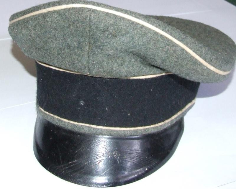 A Waffen SS NCO or enlisted man's crusher cap, with no insignia. Green wool cap is badly mothed on the crown. Black velvet cap band. No eagle or deaths head insignia, but the impression of a totenkopf badge can clearly be seen on the cap band. No chinstrap present. Black peak has some age cracking. Cream silk lining with Fosen maker mark and size 57. Leather sweatband.