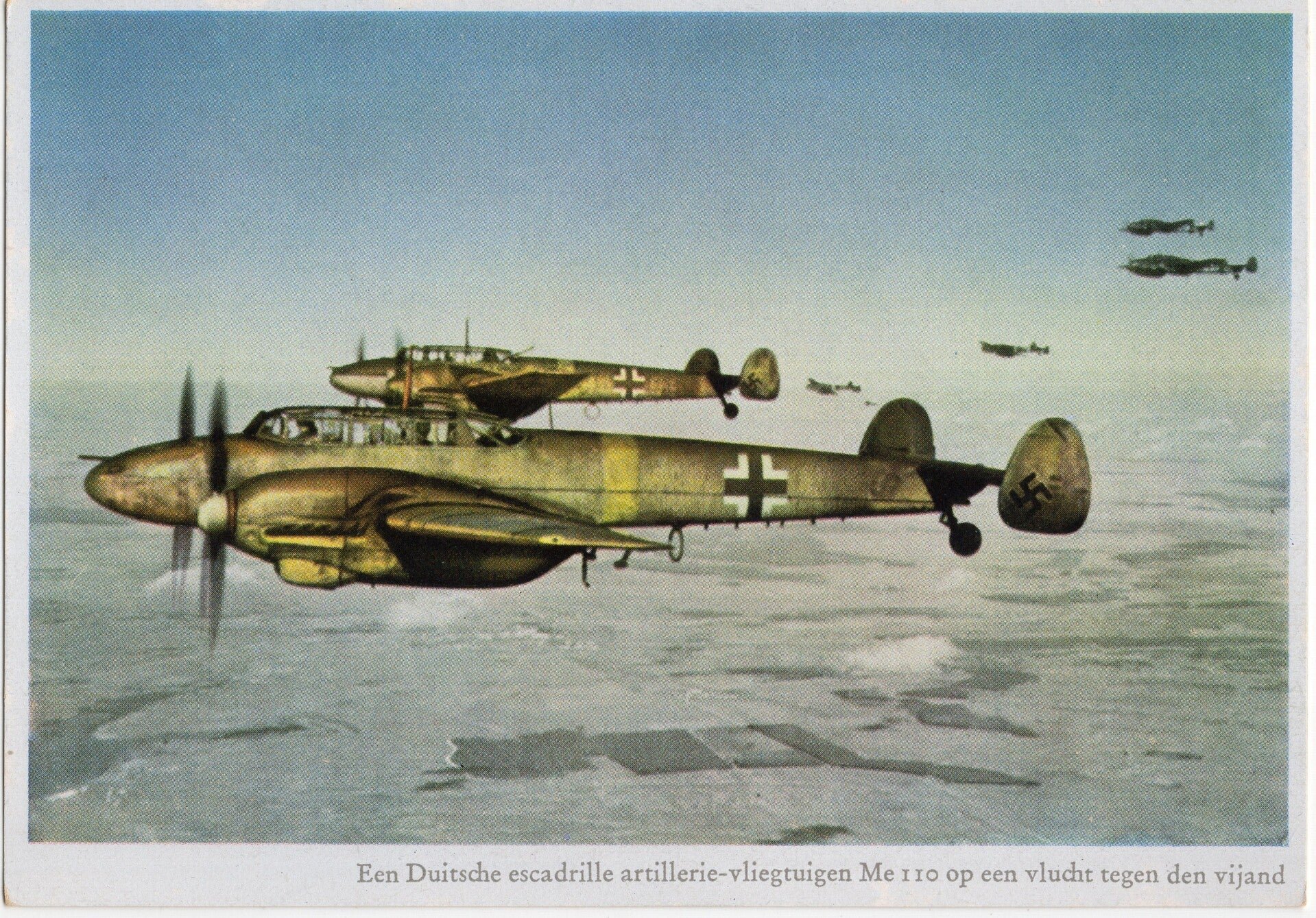 Original WW2 German Postcard - Duitsche escadrille artillerie-vliegtuigen Me 110, C. BergerPrinted by Carl Werner, Dutch languageOriginele Wo2 Duitse Postkaart - Duitsche escadrille artillerie-vliegtuigen Me 110, C. BergerGeprint door Carl Werner, Nederlandstalig