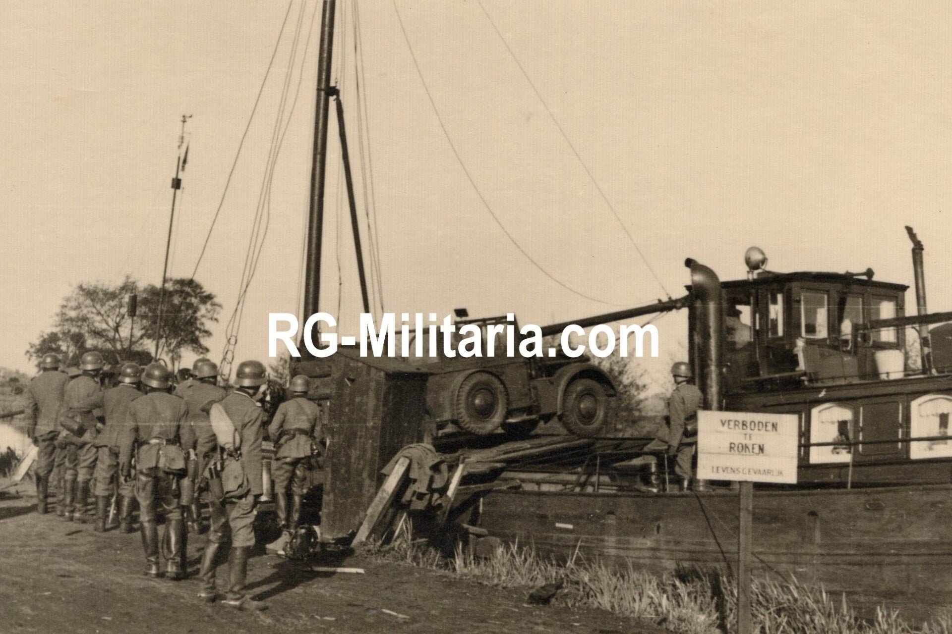Original WW2 German Photo - German soldiers entering a Dutch boat with a truck, Holland, May (1940)Approximately 10 x 7 cmOriginele Wo2 Duitse Foto - Duitse militairen met een wagen op een boot, Nederland, Mei (1940)Ongeveer 10 x 7 cm