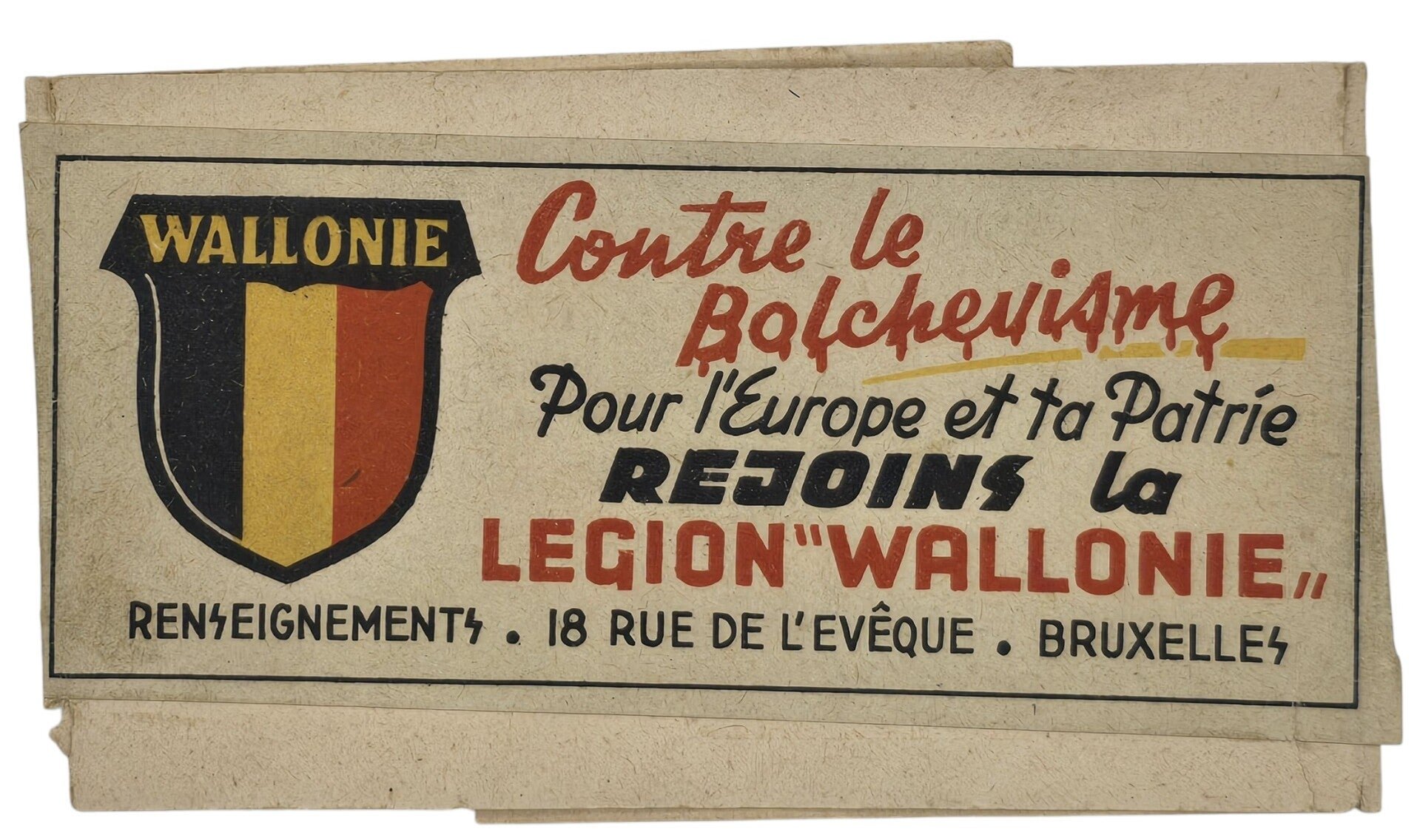 Original WW2 Walloon Waffen SS Document - Contre le Bolchevisme Rejoints la Legion Wallonie, Bruxelles (1941)Some sort of sticker, this was put on a band for more for distribution.Origineel Wo2 Waalse Waffen SS Document - Contre le Bolchevisme Rejoints la Legion Wallonie, Bruxelles (1941)Soort sluitzegel, deze is bevestigd aan een bandje.