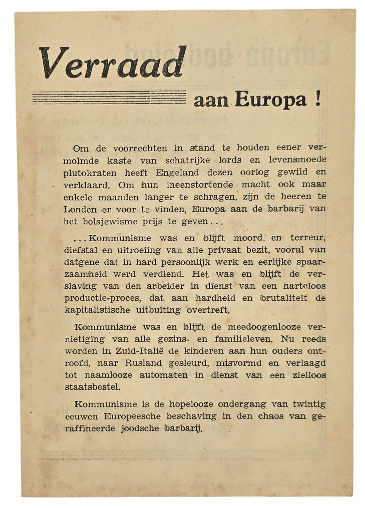 Original WW2 Flemish Waffen SS Document - Veraad aan Europa!, Werfbureel der Waffen SS, AntwerpenApproximately 11 x 15 cmRecruitment flyer for the Flemish Waffen SS. Ersatzkommando der Waffen-SS. Antisemtic.Origineel Wo2 Vlaamse Waffen SS Document - Veraad aan Europa!, Werfbureel der Waffen SS, AntwerpenOngeveer 11 x 15 cmRekruteringsflyer voor de Vlaamse Waffen SS. Ersatzkommando der Waffen-SS. Antisemitisch