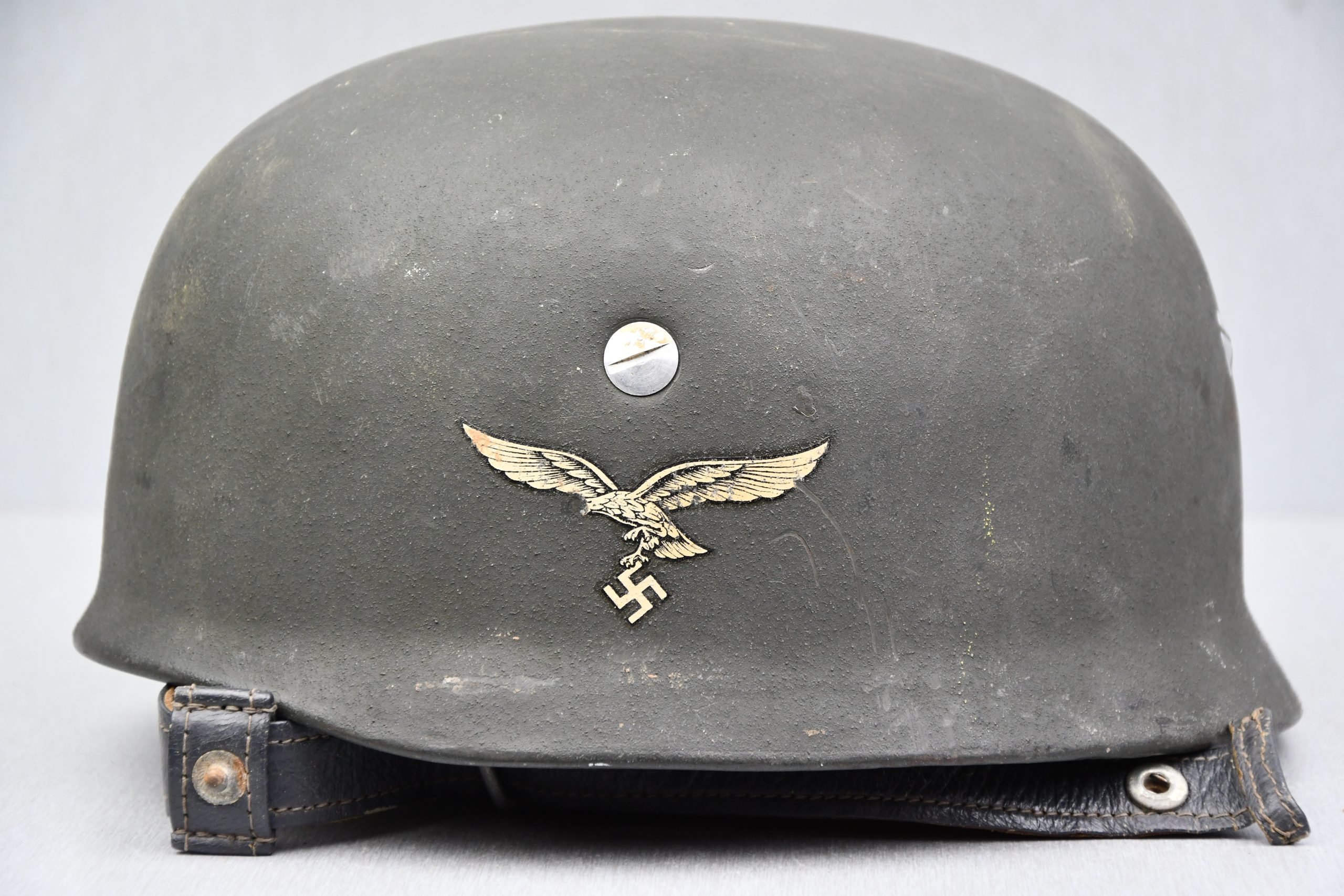 From my personal collection: Beautiful, nearly unworn M38 pattern paratrooper steel helmet. Original green coating is present. The decal is present and shows sharp details. The helmet is complete with an all original liner. The leather is supple and strong, complete with its rubber paddings. The stampings remain cleary visible; 'Baumuster: Heister, Berlin C2′ Hersteller: F.W. Müller'. Size marked; Kopfweite: Gr.55, Stahlhelm-Gr.. 66. The chin straps are full length and complete with all press buttons.The aluminum bolts on this helmet are post-war examples and added to complete the helmet. The shell is marked on the side by ET, size 66 and has the lot number 45058. Stunning and hard to find helmet.