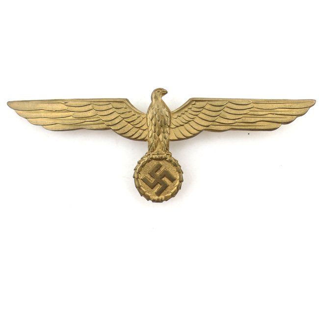 Kriegsmarine metal gilt washed breast-eagle as intended for the white summer tunic (Brustadler für Sommerrock). The eagle is not visible maker marked. The eagle is showing great details and a nice age patina. The eagle is complete with a functional pin and catch. Nice original example in good used condition! These eagles can be used for an Army General's summer tunic as well.