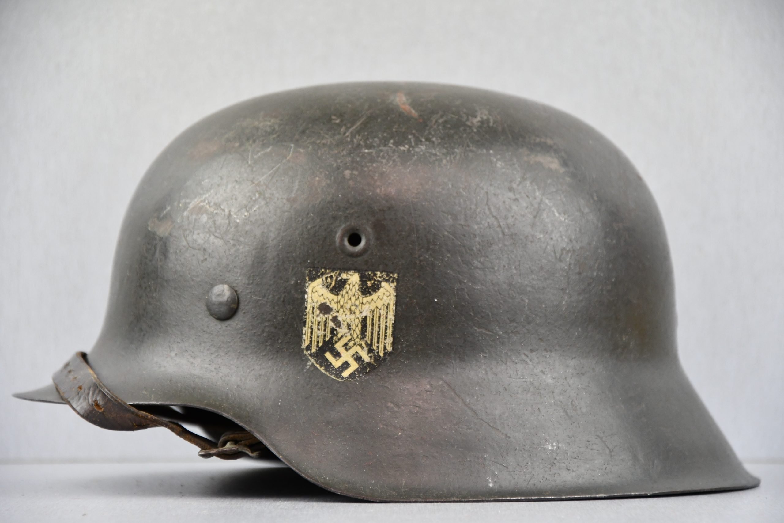 Beautiful light worn M42 pattern army steel helmet. Single decal example with the correct pattern eagle by Huber Jordan u. Koerner (aka Thin winged decal) for this maker (EF). The decal rates well over 95% and still shows sharp detail. The helmet is complete with its original liner, dated 1943 (I deem). The pig-skin leather feels strong and shows normal wear. Complete with genuine draw string and period shortened chin strap. Maker marked EF64. The lot number is 362 (I deem). A very nice and honest army helmet!