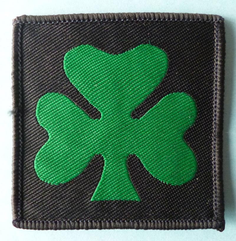 Machine-woven green shamrock on black with merrowed edge.6cms x 6cms.