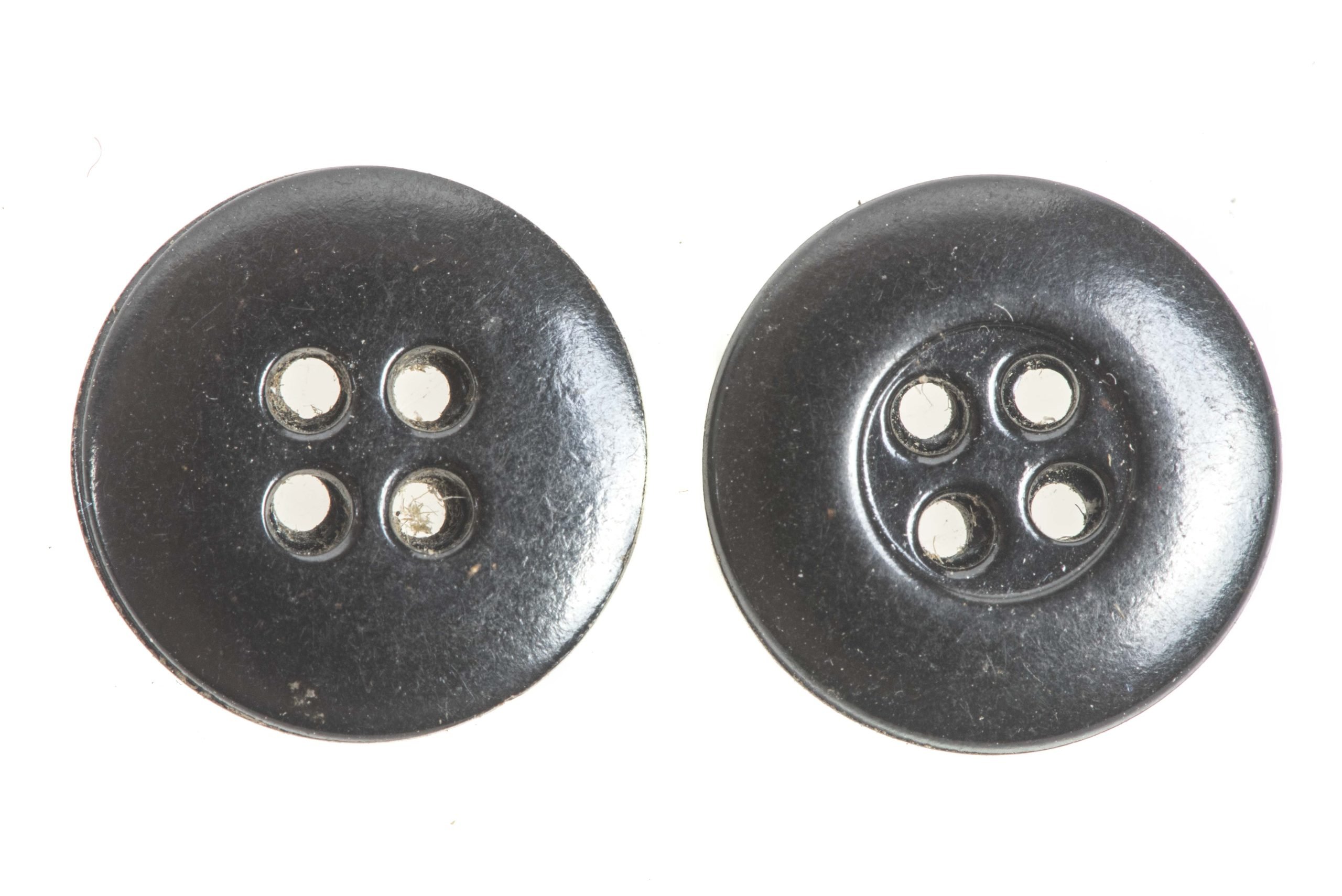 Textbook black resin 15 mm buttons for trousers, Panzer wraps and more. I have seen these buttons on Heer, Luftwaffe and Waffen-SS garments. They are textbook for grey trousers, panzer wraps and more. Hard to find button in unissued condition. I have approximately 50 identical pieces in stock. The price is per piece.