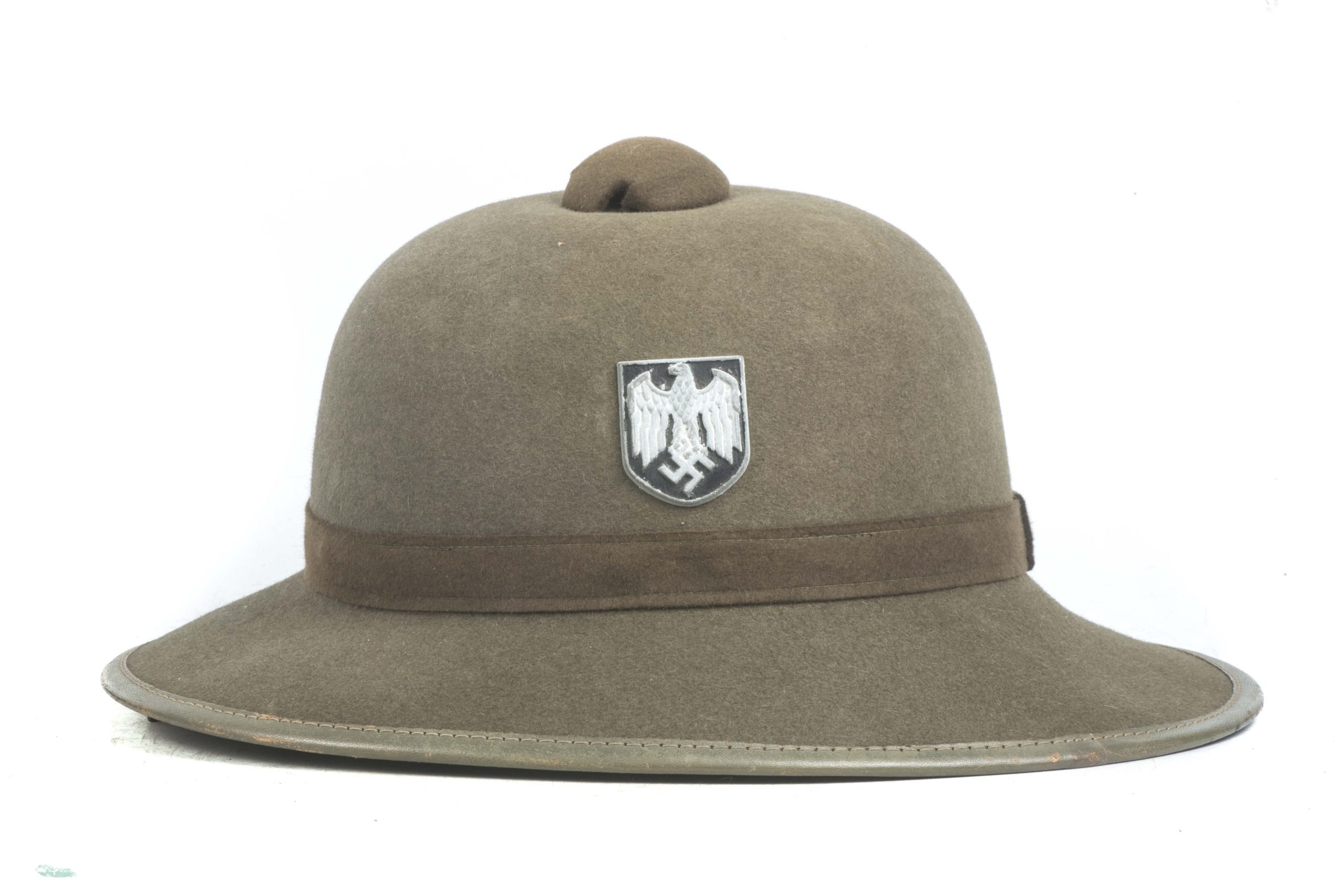 Second pattern tropical Heer pith helmet in excellent, unissued condition. Nicely maker marked F.ST.L. in the size 55 and dated 3.42. This pith helmet would be hard to upgrade!
