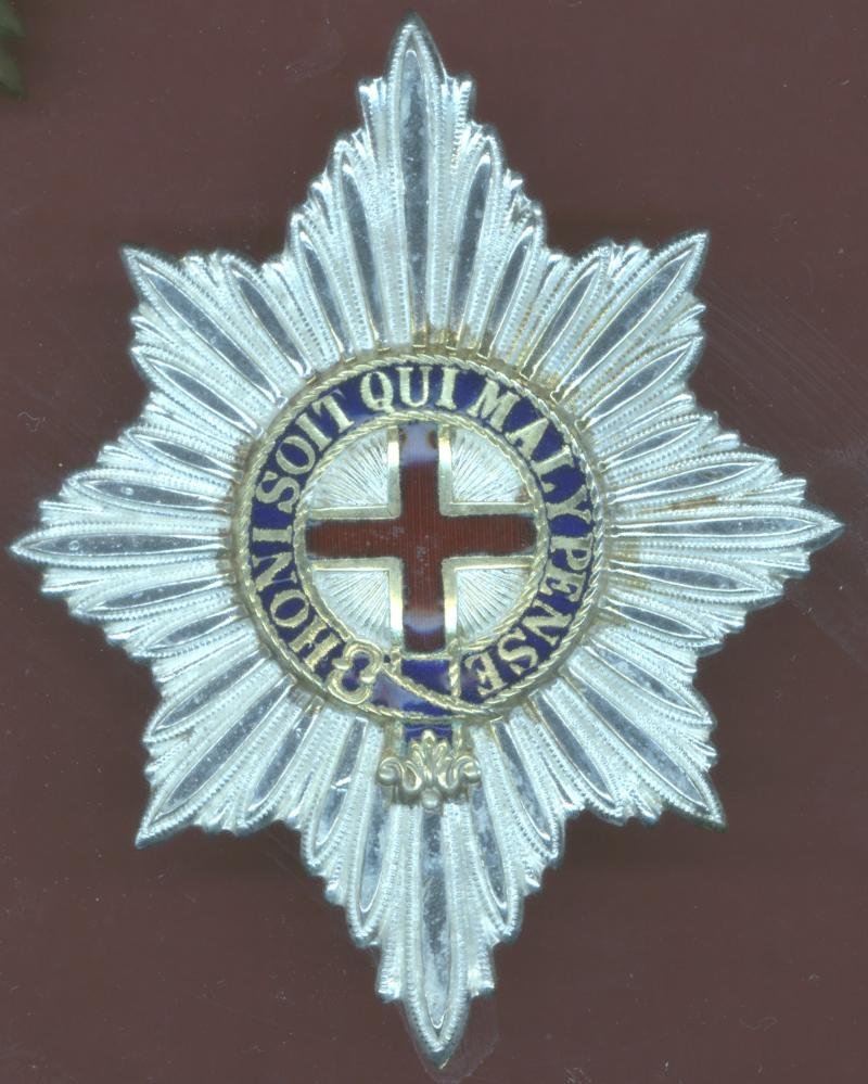 A good modern pouch badge worn on backpacks carried on parades in public places. Die stamped silvered Garter Star with blue enamel backing to the Garter and red enamel backing to the St. George's cross . Brooch pin to the reverse. VGC. Robin Hodges British Army Badges page 103, fig 27