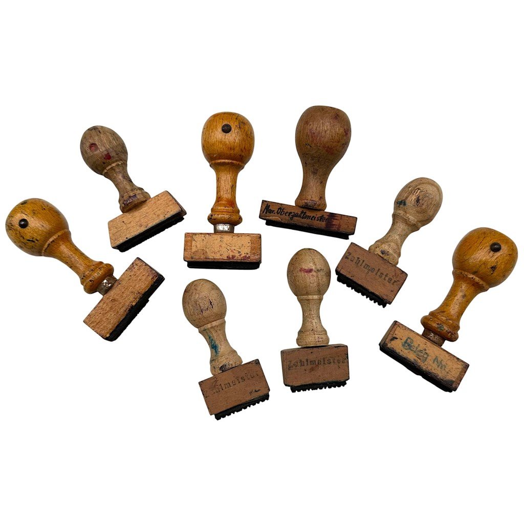 Original lot of German Army stamps from the Second World War, consisting of 8 wooden hand stamps with original stamp plates in characteristic Gothic lettering.The stamps display various rank and function titles, including 'Zahlmeister' and 'Oberzahlmeister,' designations used within the German military administration for financial and administrative roles.The wooden handles show clear signs of use and ink residue, indicating authentic period use during the war years.These stamps were intended for marking, authorizing, and administratively processing military documents, forms, and correspondence within army units.The lot originates from a larger group of stamps that also included examples bearing the place name Hilversum; however, the stamps offered here do not carry the Hilversum location name.An interesting set for collectors of German military administrative objects and original Second World War militaria.Article number: 18278Origineel WWII Duits leger lot administratieve stempelsOrigineel lot Duitse legerstempels uit de Tweede Wereldoorlog, bestaande uit 8 houten handstempels met originele stempelplaten in gotisch lettertype. De stempels tonen diverse rang- en functievermeldingen, waaronder onder meer 'Zahlmeister' en 'Oberzahlmeister', aanduidingen die binnen de Duitse militaire administratie werden gebruikt voor financiële en administratieve functies.De houten handgrepen vertonen duidelijke gebruikssporen en inktresten, wat wijst op daadwerkelijk gebruik tijdens de oorlogsjaren. Deze stempels waren bedoeld voor het markeren, autoriseren en administratief verwerken van militaire documenten, formulieren en correspondentie binnen legeronderdelen.Het lot is afkomstig uit een grotere partij stempels waarin zich ook exemplaren met de plaatsnaam Hilversum bevonden; op de hier aangeboden stempels is echter géén plaatsnaam Hilversum aanwezig.Een interessante set voor verzamelaars van Duitse militaire administratieve objecten en originele Tweede Wereldoorlog militaria.
