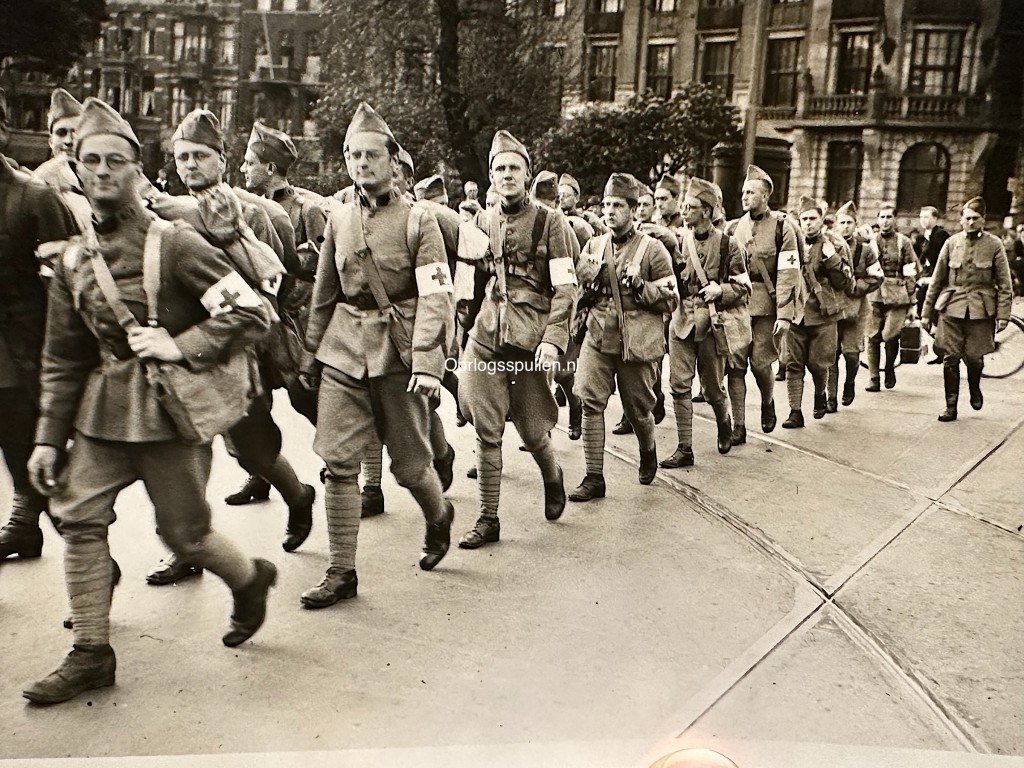 Original pre-1940 Dutch Army photograph depicting a column of uniformed soldiers marching through a city street, identifiable by their Red Cross armbands and field equipment.The image captures the atmosphere of the mobilization period just prior to the Second World War, showing a well-ordered group of troops in field uniform set against a vivid urban backdrop with characteristic pre-war architecture.Of interest to collectors of Dutch military history, mobilization-period memorabilia, and early press photography.Dimensions: 18 x 13 cm.Article number: 18284Originele Pre 1940 Nederlands leger hospik fotoOriginele pre-1940 Nederlandse legerfoto met een colonne militairen die in uniform door een stadsstraat marcheert, herkenbaar aan de Rode Kruis-armbanden en uitrusting.De opname toont de sfeer van de mobilisatieperiode vlak vóór de Tweede Wereldoorlog en toont een strak geordende groep soldaten in veldtenue, vastgelegd in een levendig straatbeeld met karakteristieke vooroorlogse bebouwing op de achtergrond. Interessant voor verzamelaars van Nederlandse militaire geschiedenis, mobilisatie-periode memorabilia en vroege persfotografie.Afmetingen: 18 x 13 cm.