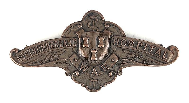 A very scarce original First World War period 'Northumberland War Hospital pin badge' bronzed ornate bar depicting a shield bearing three Castle turrets on lined ground within title scrolls; the reverse with embossed maker's details 'REID & SONS NEWCASTLE -UPON-TYNE'. Very good condition, complete with original pin fittings.Width approx 46mm.Northumberland War Hospital was established in Gosforth, Newcastle-upon-Tyne, utilizing the former Newcastle City Asylum. It served as a major facility for treating wounded soldiers.
