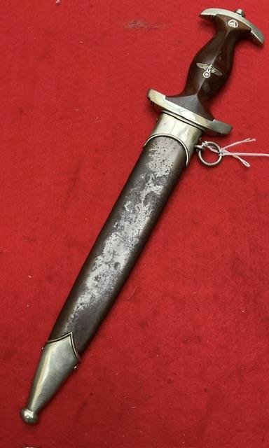 Blade in excellent condition, shows runner marks but no nicks or rust marks. Dent free anadozied scabbard. All nickel fittings, screws un turned. Dent and nick free dark wood grip with excellent fit to cross guards. Stamped on cross guard and top scabbard mount, lovely item.Age restricted item