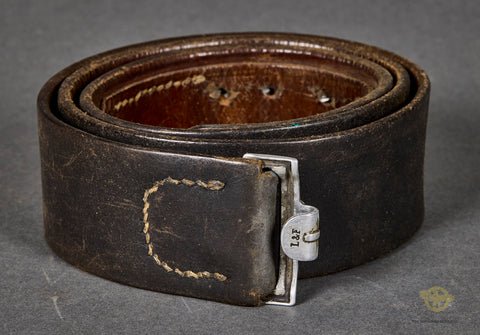 German WWII Wehrmacht Combat Field Belt-This is a very interesting combat belt. This is a brown leather belt that is still quite soft and supple. This belt is very well marked and dated 1941 on the tongue. The aluminum catch is also maker marked L&F. The belt is marked 92 for size in cm. It measures 37 inches in length, so will fit up to a size 34 inch waist. There appears to be a name carved into the inside leather, we believe it reads 'Kiöll' but see what you think. An interesting personalized belt in good shape.