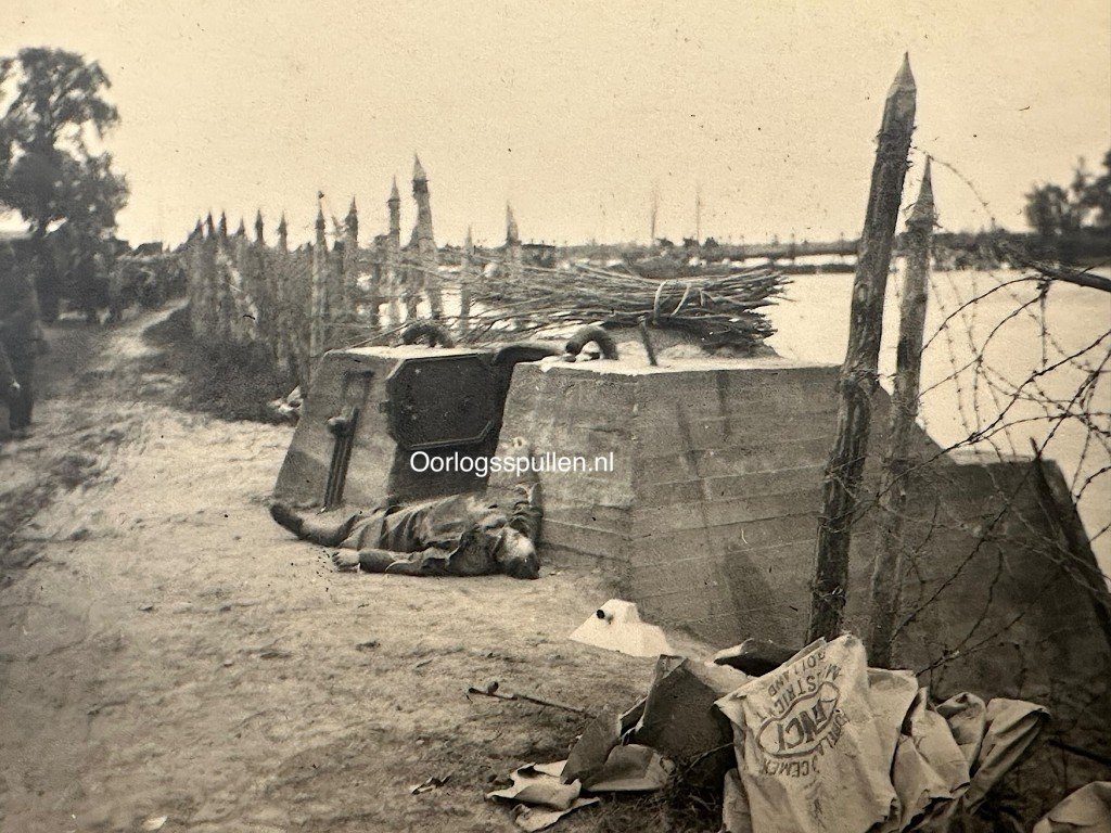 Original black-and-white photograph from May 1940 depicting a fallen Dutch soldier lying beside a concrete bunker emplacement along a waterway. The image captures a poignant moment from the days of the German invasion of the Netherlands. On the left side of the photograph, German troops are seen marching past along the path, emphasizing the stark contrast between the fallen defender and the advancing occupying forces. In the background, field fortifications, wooden obstacles, and barbed wire are visible, characteristic of the improvised Dutch defensive lines of that period.Dimensions: 9 x 6 cm.Article number: 18301Originele Mei 1940 Foto van gesneuvelde Nederlandse militair bij bunkerOriginele zwart-wit foto uit mei 1940 waarop een gesneuvelde Nederlandse militair te zien is, liggend bij een betonnen bunkerstelling langs een waterweg. De opname legt een indringend moment vast uit de meidagen van 1940, tijdens de Duitse inval in Nederland. Links in beeld marcheren Duitse troepen voorbij over het pad, wat het contrast benadrukt tussen de gevallen verdediger en de oprukkende bezettingsmacht. Op de achtergrond zijn veldversterkingen, houten versperringen en prikkeldraad zichtbaar, typerend voor de geïmproviseerde Nederlandse verdedigingslinies in die dagen. Afmetingen: 9 x 6 cm.