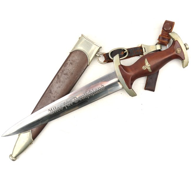 Early SA M33 Dagger (Dienstdolch M33). Nice pre-war dagger, the dagger has a wooden grip, the grip has a nicely inset nickel-silver national eagle and a nickel/silver enameled runic SA button. The dagger comes with its original brown anodized, magnetic sheet metal scabbard with solid nickel-silver fittings. The blade bears the inscription 'Alles für Deutschland' (Everything for Germany), the reverse ricasso is well marked with the etched manufacturer's marking indicating production by the company of 'Kaufmann & Söhne' from Solingen which is a rare maker. According to information I found this manufacturer only produced around 8000 daggers.The lower crossguard has a 'Wm' stamp for SA-Gruppe 'Westmark'. The blade is in good condition and has some typical runner marks and some minor scratching, see photos. The blade is showing nice crossgraining when hold up against the light.The dagger is complete with original 3-piece leather hangers as found together. Stunning original early dagger from a rare maker!