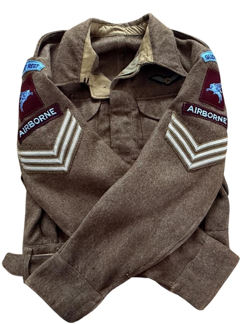 A very attractive British 1937 Pattern Battle Dress Blouse. The blouse is mounted (re-sewn) with all original insignia to a 2nd Sergeant.of the Glider Pilot Regiment The insignia compromises a pair of embroided Glider Pilot Regiment shoulder titles, embroided Pegasus formation patches,,embroided Arborne and Sergant stripes . The Glider wing attached on the breast compromises a 2nd pilot example. The battle dress is in overall nice near mint condition and fitted with original label. Dated 1942 and sized 13. the jacket is War Department marked and market with lettercode 'O' indicating 1942. A highly attractive battle dress as worn by a 2nd Glider Pilots during D-Day and operation Market Gardenand Rine crossing Would be hard to upgrade.Please note: payment by banktransfar or cash