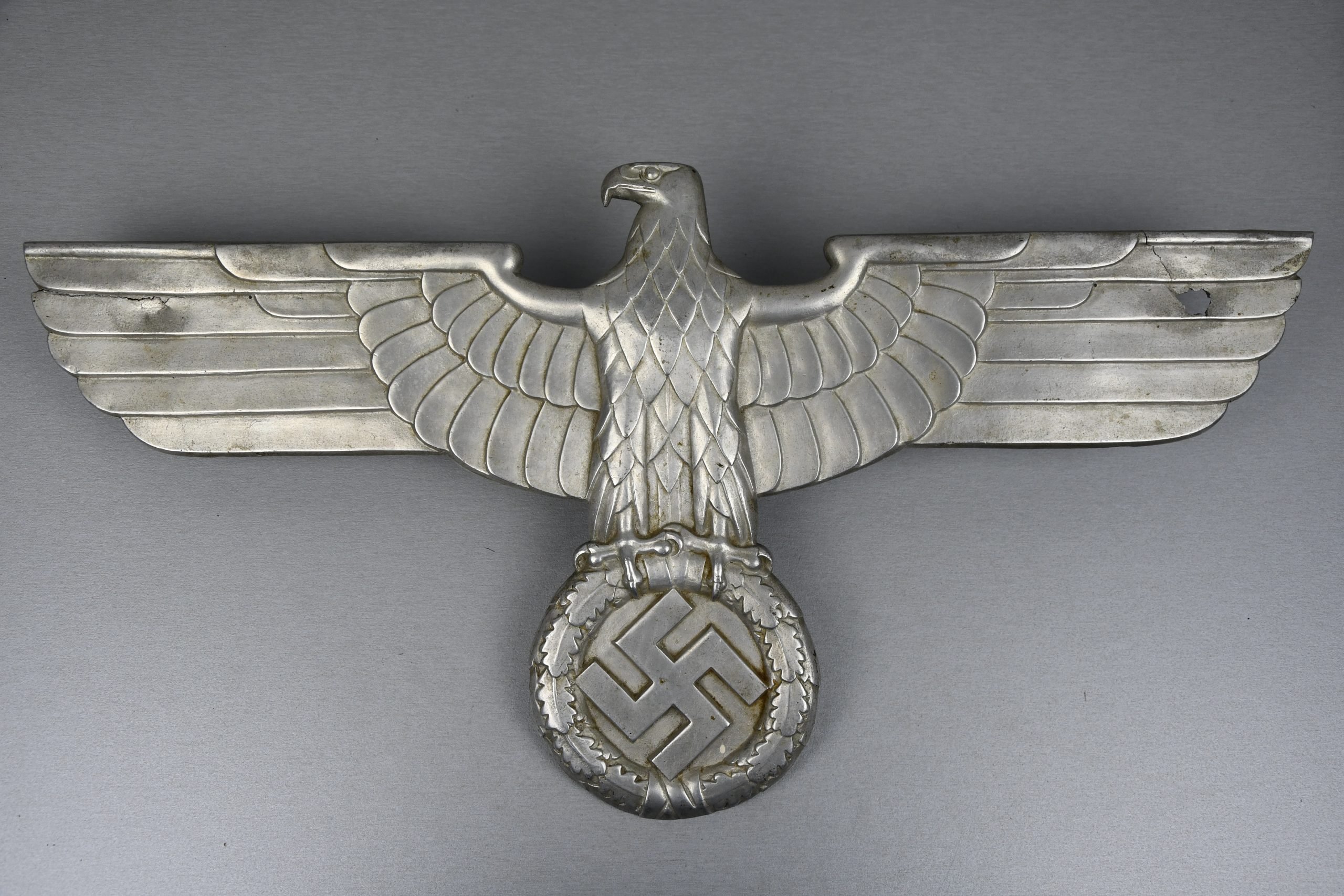 Excellent and very desirable Third Reich Railroad (Reichsbahn) locomotive eagle in alloy. 27 inch (69cm) example in good condition, still shows sharp details. This eagle is also made by HE (written on the back). Helmet taken from a railway wagon by an American soldier as souvenir. He damaged the wing while tearing it off and the stud remained in the wagon leaving a small hole – true 'bring-back souvenir hunting' patina! A beautiful example, would look great in any collection room!