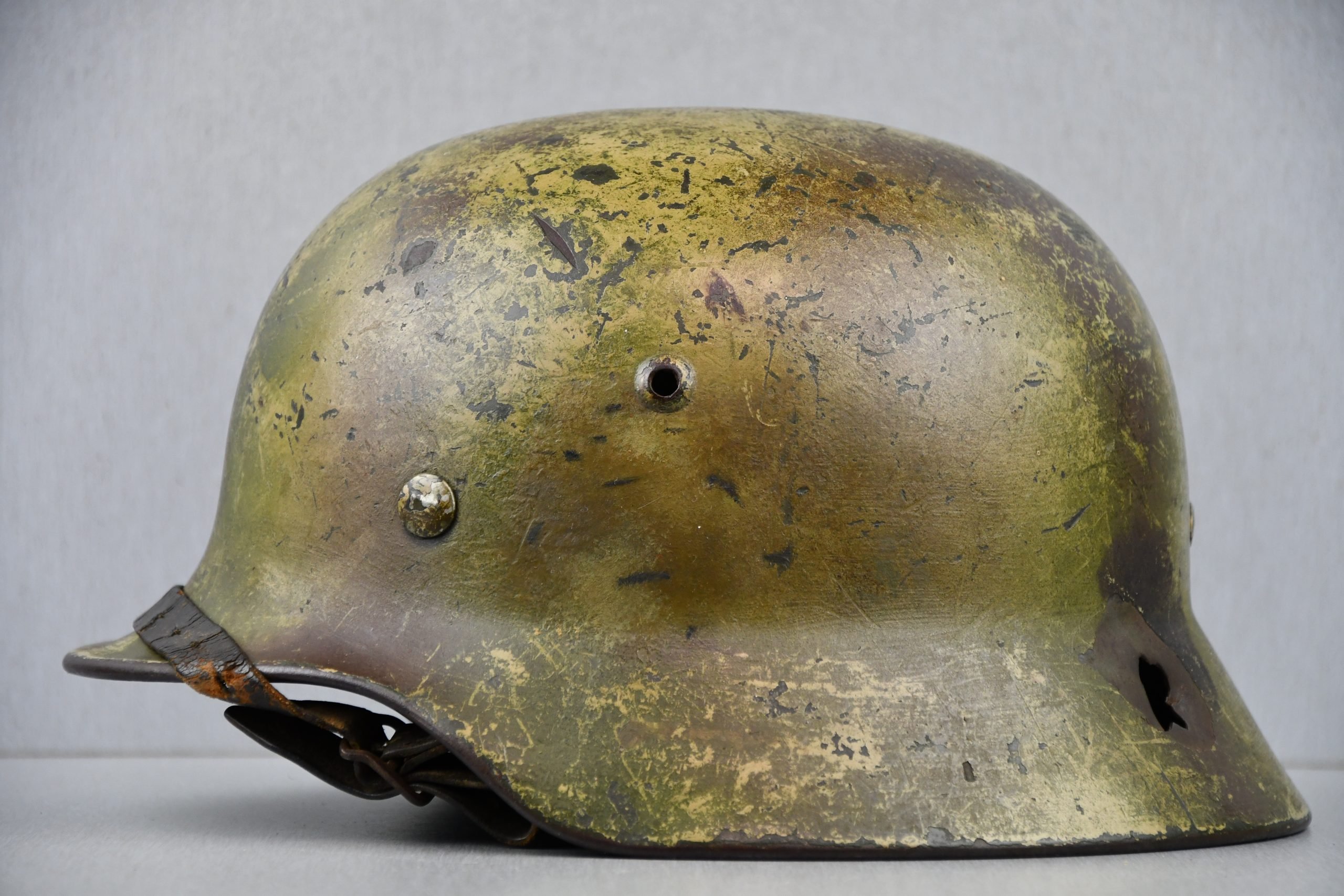 Beautiful one-looker Wehrmacht camouflage helmet is so called Normandy colors. The helmet started as a double decal army helmet that first got overpainted in rough green paint in ca. 1940 as often observed. Afterwards the helmet received a spray layer of tan colored vehicle paint and was spray painted with red/brown & green stripes across the lid. Complete with liner, having the correct early aluminum band, dated 1937. The early non-reinforced alu band shows the normal weaknesses and cracks, and even lost a D-ring, hence the chin strap was attached around the liner springs. The leather shows normal wear and is complete with draw string and chin strap. Nice the see the helmet was struck with a bullet in the rear, that also damaged a part of the liner. Shell is marked by EF size 62. Lot number remains hard to read because it's hidden under the reissued paint. A beautiful Normandy camouflage helmet with combat damage!