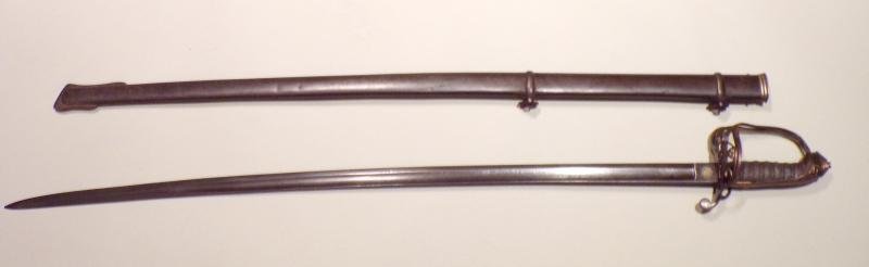 A Victorian Infantry Officers Sword with gilt brass hilt non folding guard, so post 1850. A ray skin grip bound with twisted and two single strand wire. The guard has a light depression in the frame, which is seen a lot with type of sword, probably a result of battle damage. A good slightly curved single fullered blade now with a dark tone, I think this commonly caused by greasing the blade with engine grease, better to use natural Bee's wax, due to the darkening of the blade the etching is a little faint. No makers details, I can see but a proof mark, used by Robert Mole of Birmingham. It has its original steel, two ring scabbard which is also toned very dark but no rust or pitting on the scabbard or the blade. Very good condition, measuring 38 inches long.Shipping to UK mainland only via courier priced at £13.95