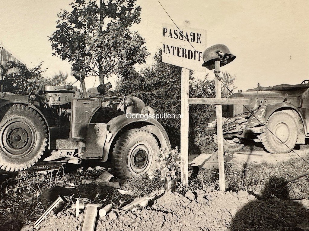 Original German photograph from the Second World War, taken in France, showing two military vehicles positioned along a road beside a sign reading 'Passage Interdit.'Mounted on a wooden cross next to the sign is a German steel helmet, visibly damaged and pierced by shrapnel holes.The vehicles display signs of combat, and scattered equipment on the ground reinforces the impression of a recently contested battlefield in a rural setting.The photograph measures 9 x 6 cm.An interesting piece for collectors of German Second World War photography.Article number: 18309Originele WWII Duitse foto van veldgraf met kapot geschoten helm in FrankrijkOriginele Duitse foto uit de Tweede Wereldoorlog, genomen in Frankrijk, waarop twee militaire voertuigen langs een weg zijn vastgelegd bij een bord met de tekst 'Passage Interdit'.Op een houten kruis naast het bord is een Duitse stalen helm geplaatst, zichtbaar beschadigd en voorzien van scherfgaten.De voertuigen tonen sporen van gevechtshandelingen en verspreid liggend materieel versterkt het beeld van een recent strijdtoneel in de landelijke omgeving.De foto heeft een formaat van 9 x 6 cm.Interessant voor verzamelaars van Duitse Tweede Wereldoorlog-fotografie.