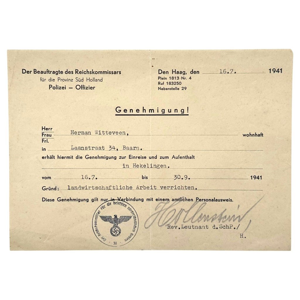 Original German occupation document from the Second World War, issued by Der Beauftragte des Reichskommissars für die Provinz Süd-Holland – Polizei-Offizier, dated The Hague, July 16, 1941.This is an official Genehmigung (permit) granted to Herman Witteveen, residing at Laanstraat 34 in Baarn. The document authorizes entry and residence in Hekelingen for the period from July 16 to September 30, 1941. The stated reason is 'landwirtschaftliche Arbeit verrichten' (to perform agricultural work). The permit was valid only in conjunction with an official identity card.The document bears an original signature of a police official (Rev. Leutnant d. SchP.) and is stamped with a clear official seal featuring the National Socialist eagle and swastika of the office of the Reichskommissar.A historically interesting collectible for enthusiasts of Second World War documents.Article number: 18313