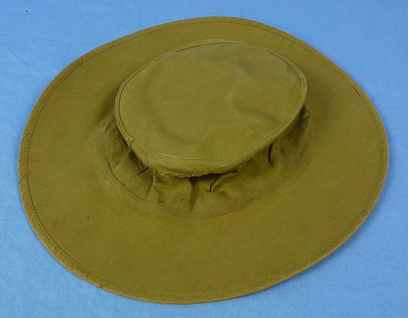 The rubberized boonie hat is somewhat stiff with age. The crown has a 1-1/4 inch separation at the crown. The interior is manufacturer marked and dated November 30, 1943, with a stated size of 6-3/4.
