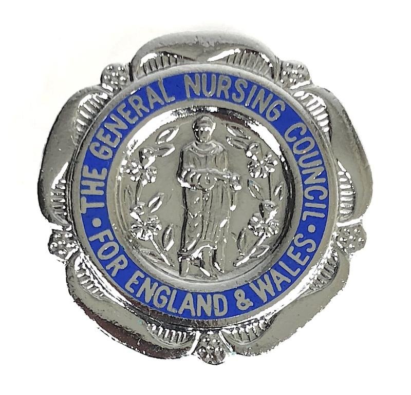A good original circa 1972 issue 'General Nursing Council For England & Wales State Registered Nurse chromium plated enamel pin badge', the reverse impressed with maker's details 'Thomas Fattorini Regent St. Birmingham' and awarded to 'G. H. KHO. S.R.N. 448351 28. 3. 72'. Very good clean condition, complete with original pin fittings, no damage to the enamel.Diameter approx 27mm.
