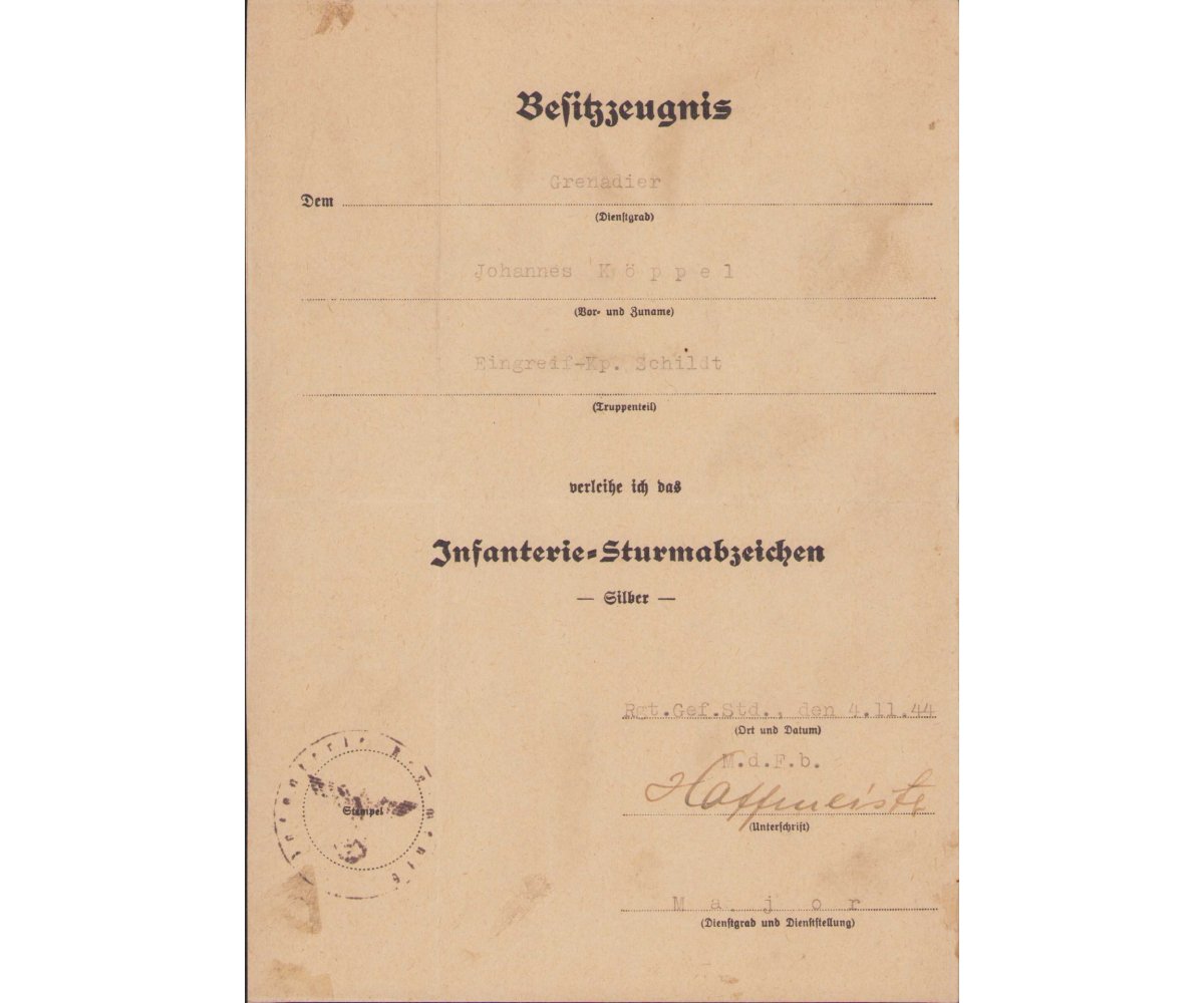 Very nice Wehrmacht Grenadier related Infanterie Sturmabzeichen award document in used, but good condition.