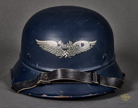 German Luftschutz Model 1938 Helmet-This excellent example of the three piece 'gladiator' style helmet has a dark blue finish that remains 98% intact. The decal is in great shape, remaining 90% intact with minor wear. Each side has a pair of salt and pepper shaker ventilation holes. The liner band and tan leather liner are fully intact and in excellent condition. The rear skirt has some markings, including the size, 55, price, 8 Rm and script that indicates that this meets the proper specifications. It is also stamped RL2-38/28. The original, wide grey ersatz leather chinstrap is present as well. This is a great example overall!