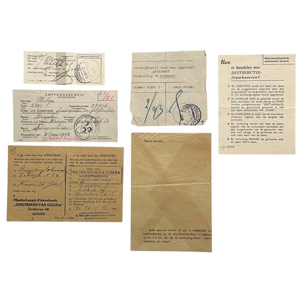 An original and historically interesting set of Dutch World War II documents, consisting of various personal and administrative papers from the occupation period in Krimpen aan den IJssel.The set includes, among other items, a receipt for a Philips radio set (1943), a receipt for the surrender of a ration card, instruction cards for distribution registration cards, a health insurance and employment-related form from the shipyard 'Van der Giessen & Zonen' in Krimpen aan den IJssel (1941), and additional accompanying documents.The papers show clear stamps, signatures, typewritten and handwritten entries, offering a fascinating insight into daily life and the administrative reality during the German occupation of Krimpen aan den IJssel, including rationing, registration, employment, and radio licensing.A World War II document set of strong historical interest, appealing to collectors of Dutch WWII memorabilia and regional occupation-era documents.Article number: 18332Originele WWII Nederlandse documenten set Krimpen aan den IJsselEen originele en historisch interessante set Nederlandse documenten uit de Tweede Wereldoorlog, bestaande uit diverse persoonlijke en administratieve papieren uit de bezettingsperiode van Krimpen aan den IJssel . De set omvat onder meer een ontvangstbewijs van een Philips radiotoestel (1943), een bewijs van inname van een geldkaart, instructiekaarten voor distributie-stamkaarten, een ziektekosten- en werkgerelateerd formulier van de scheepswerf 'Van der Giessen & Zonen' te Krimpen aan den IJssel (1941) en aanvullende begeleidende documenten. De papieren tonen duidelijke stempels, handtekeningen, typemachine- en handgeschreven invullingen en geven een bijzonder inkijkje in het dagelijkse leven en de administratieve realiteit tijdens de Duitse bezetting van Krimpen aan den IJssel , zoals distributie, registratie, werk en radiovergunningen. Een documenten set uit de Tweede Wereldoorlog, interessant voor verzamelaars van Nederlandse WOII-memorabilia en regionale bezettingsdocumenten.