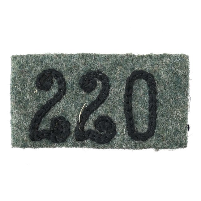 Single WH (Heer) Shoulder Strap 'slip-on' ('Überschübe') as intended for a 'Soldat des Pionier-Bataillon 220'. The slip-on is showing the nicely 'chain-stitched' embroidered regimental numbers '220' in black on a fieldgrey woolen background. The black branch-colour is indicating a soldier within an Engineer unit. Hard to find slip-on in very good condition!