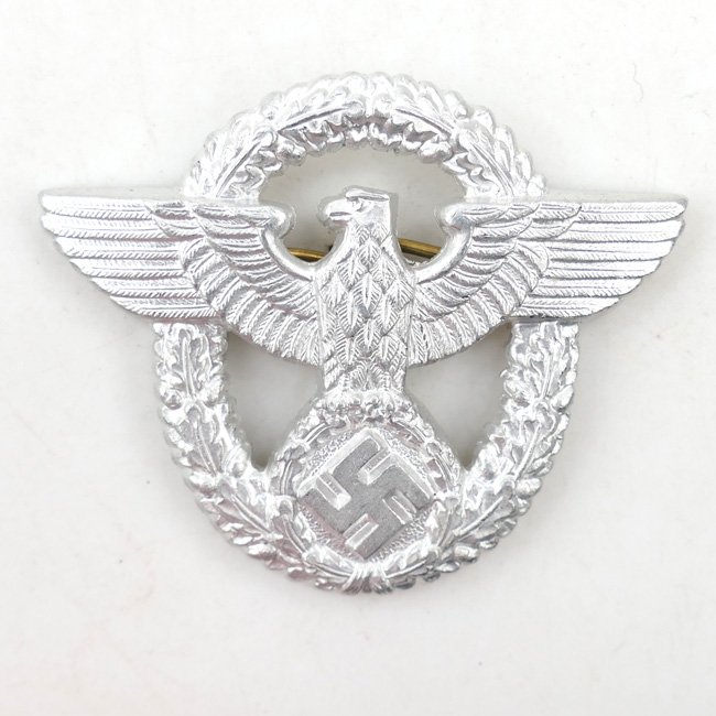 Polizei Visor Cap Eagle (Mützenadler). This is a 2nd Pattern as introduced on 25 June 1936. The aluminum police cap-eagle is complete with both prongs. The eagle is not visible maker marked. Nice example in very good condition!