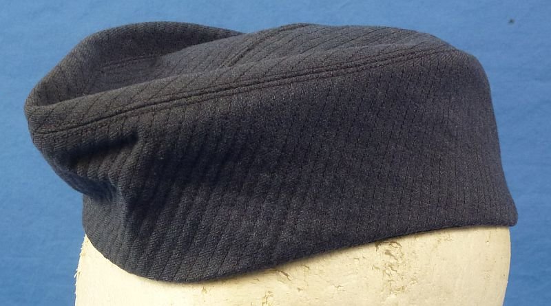 The blue wool garrison cap exhibits some signs of wear and use, but overall it is in very good condition. It is tagged as a size 21-1/2.