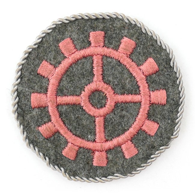 WH (Heer) Panzer Personnel's Trade Badge as intended for a 'Handwerker' (Tätigkeitsabzeichen für Kraftfahrzeugtechnisches Personal). Machine embroidered pink coloured cog-wheel on a base of fieldgrey wool badge-cloth, having a silver piping as intended for a 'Handwerker' (Panzer and/or vehicle mechanic). Nice original example in very good condition!