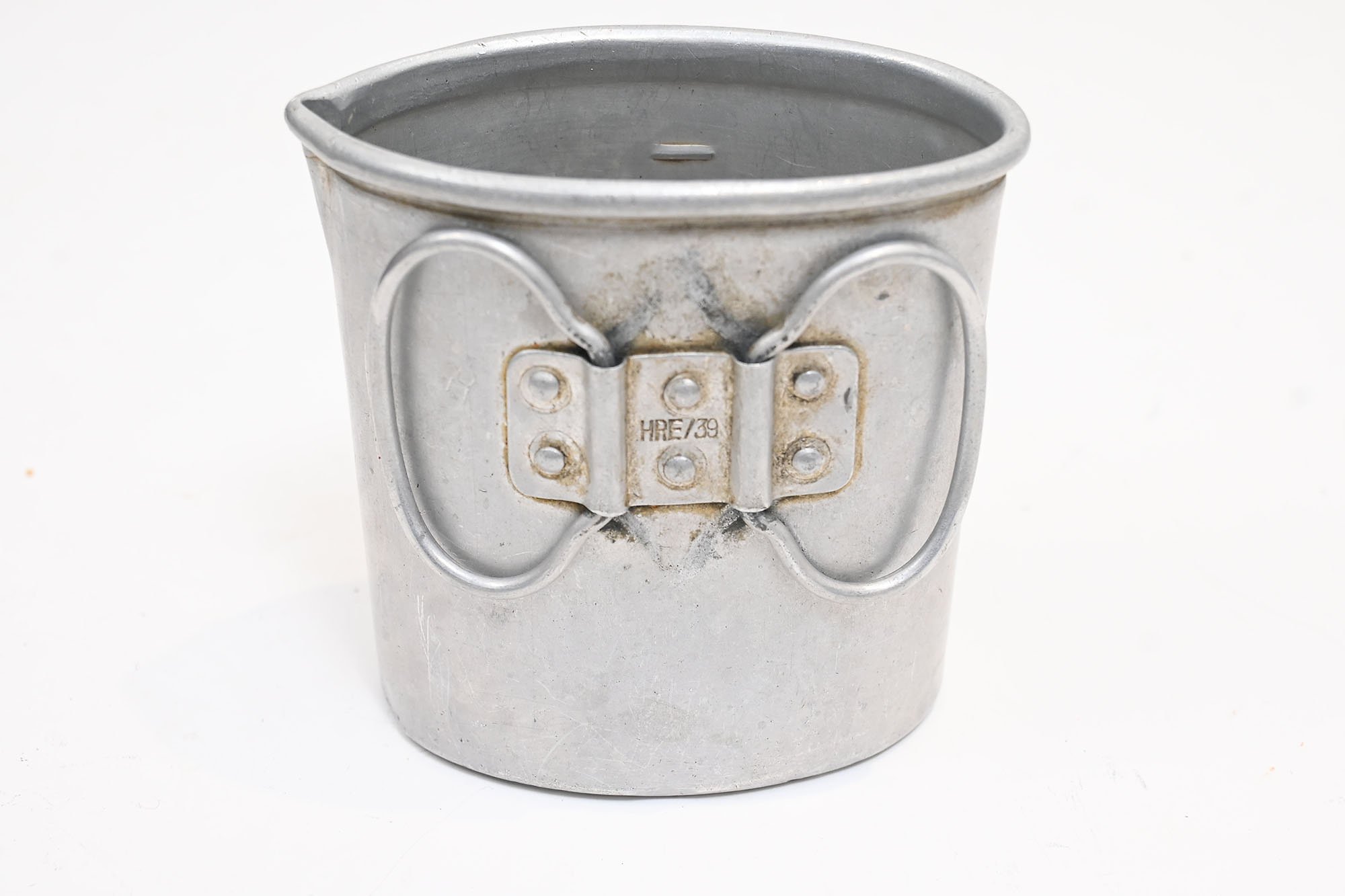 Aluminum Wehrmacht canteen cup, 1/4 liter, in very good condition. Marked HRE 40, which stands for manufacturer Heinrich Ritter of Esslingen.