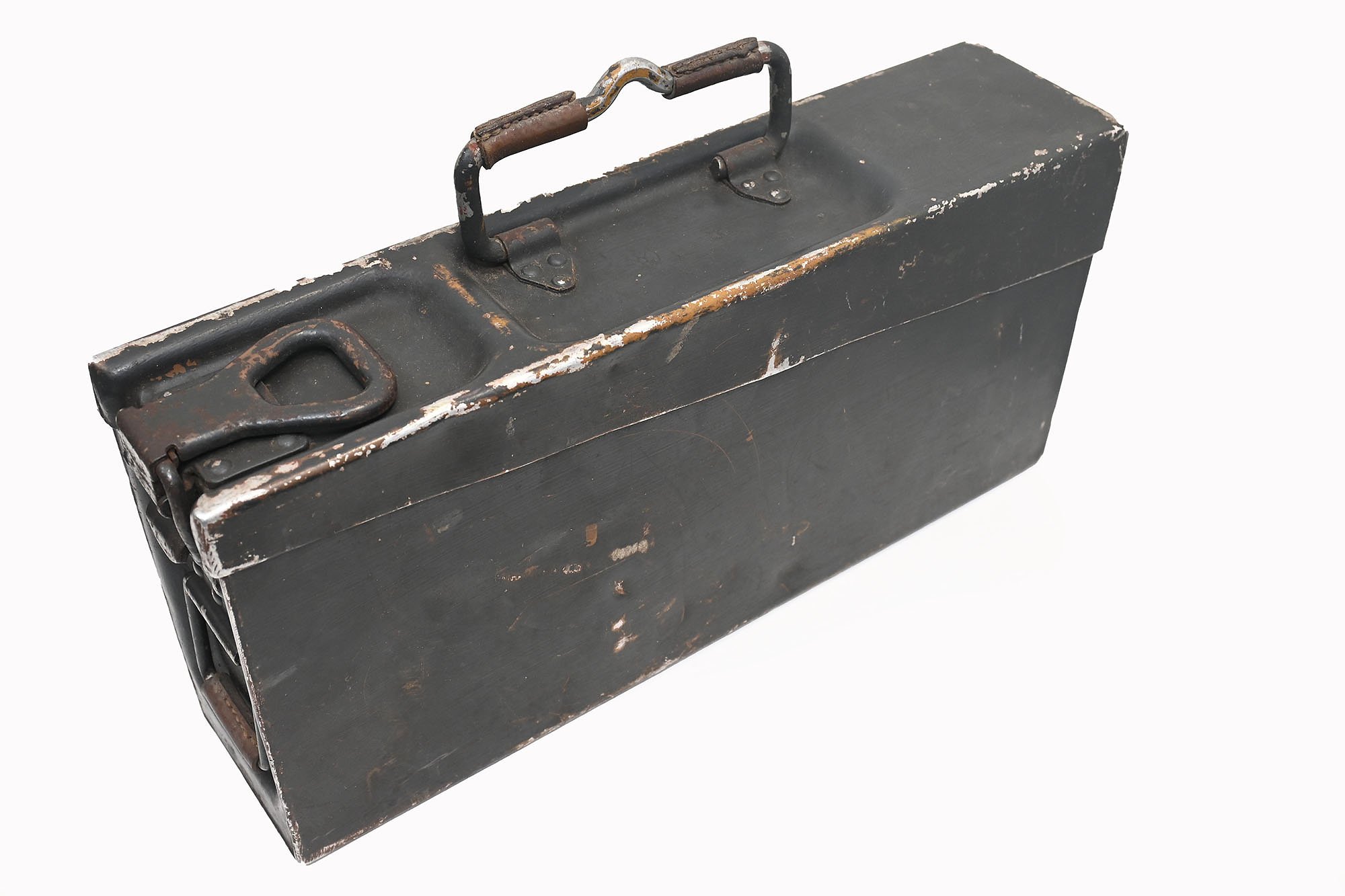 very nice 1938 dated aluminum mg cartridge cases.complete with all the washers.beneath the original grey colour is still the early reichswehr camouflage.very nice and hard to find mg cabinets.