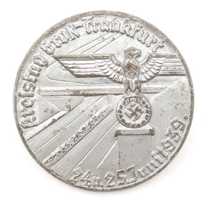 'NSDAP Kreistag Groß-Frankfurt' 1939 Tinnie (Veranstaltungsabzeichen), this event was held on 24 & 25 June 1939. The tinnie is showing an image of the 'Reichsautobahn'. The zinc type tinnie has a pin-back device to its reverse. The tinnie is maker marked by 'E.Ferd Wiedmann' from Frankfurt am Main. Nice original NSDAP tinnie!