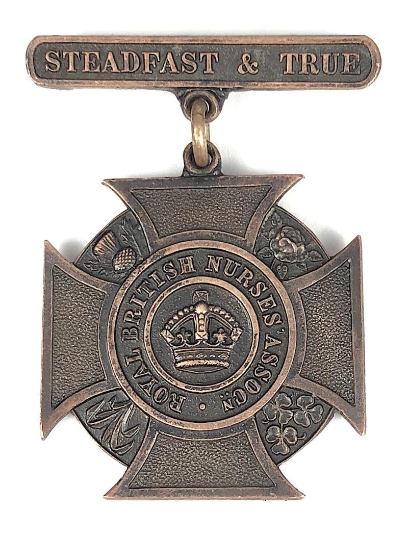 A good original early part of the 20th century 'Royal British Nurses Association pin badge'; bronzed cross bearing Thistle, Rose, Leek and Shamrocks between each arm, the central title circlet bearing Crown, suspended from a pin bar inscribed 'STEDFAST & TRUE'; the reverse engraved with the recipients script naming 'A.L.TEWKES 5801'. Very good condition, complete with original pin fittings.Height approx 48mm.