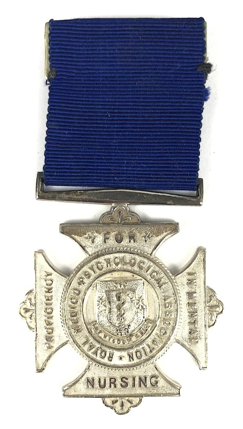 A scarce original circa 1927 period 'Royal Medico-Psychological Association For Proficiency In Mental Nursing' nurses silver badge, the reverse impressed with Birmingham silver hallmarks for 1927 maker' details 'WD&S' (W M Dowler & Sons) and inscribed 'A.S. SMITH'. Very good condition, complete with original blue silk ribbon with suspension bar with pin fittings. Very good clean condition.Height approx 79mm.