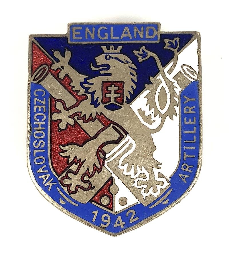 A very scarce original circa Second World War period British made 'Free Czech Artillery in England 1942 pin badge'; in the form sliver plated shield inlaid with red, white and blue enamel, the centre depicting an Czechoslovak lion superimposed over crossed artillery gun cannons within title surround. Very good condition, complete with original pin fittings, no damage to the enamel, minimal service wear.Height approx 34mm.