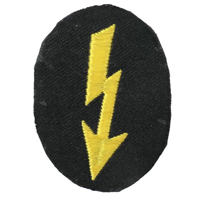 German Female Signal Auxiliaries (Nachrichtenhelferin des Heeres) Armbadge. The Female Signals Auxiliary Corps (Nachrichtenhelferinnen des Heeres) were organized in a military system and were tasked with all aspects of communications within the occupied countries and in certain military communications centers within Germany that required special security that was unsuitable for civilian personnel. Personnel serving with the Female Signals Auxiliary Corps were outfitted with uniforms and insignia, including the arm-badges showing a yellow lightning blitz. The armbadge is woven in the so-called BeVo weave pattern in golden/yellow thread on a black background. Scarce original armbadge in clearly used and tunic removed condition!