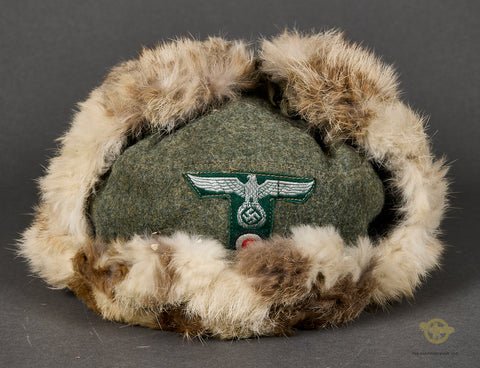 Third Reich German Land Customs Rabbit Fur Winter Cap-This is a great example of a scarcely encountered cap style. The white with brown rabbit fur is fully intact. The body is made of field grey wool which is in fine condition. The flaps are tied up top. It has an NCO type, Land Customs flat wire T type insignia over green rayon. It is hand applied. The interior is padded and fully lined in green/ grey cloth. It is ink stamped with the size, 57. Excellent condition!