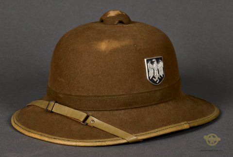 German WWII Army Pith Helmet by JSH-This example has a darker brown felt body over a rigid shell. There is felt loss to the top button, and to left upper corner. Both of the shields are present and in very good condition. The green leather trim around the brim is mostly missing. The same leather is used for the chinstrap, which is only partially intact. The underside of the brim is green felt. The interior is lined in a dusky red cloth that has wear and discoloration. The tan leather sweatband is in 'as found' condition with several tears. It has an embossed maker logo that reads 'JHS'. There are some cracks to the red felt inside.A sound example overall. This would make a nice display piece.
