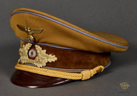 German WWII Political Leader Visor Cap (Orts Level)-This is a gorgeous example of a political leader's visor cap for a leader in the ORTS level of government, which means it is piped in blue. Remember there were four levels of the NSDAP Political government, similar to how we have things today in the states. There is the local level (towns and cities) which is called ORTS, The KREIS orKreisleitunglevel which is Districts or German counties. The GAU orGauleitungwhich is the Regional level (German states and their provinces). REICH is thenationalgovernment similar to our Federal Govt. level. This is blue piped for ORTS level. The piping is a light blue color and some very slight moth damage. This cap has a beautiful saddle shape and the exterior and the brown center band is damage free, as is the beautiful celleon officer's chin cord. The beautifully gold gilted finish on the eagle has a very nice tone, with the original finish is mostly intact. The gilt finish on the stylized wreath has a nice matte gold tone to match the eagle.This wreath has beautiful detailing. The enameled cockade is in very good condition. The dark brown visor has been reinforced to the cap by a collector, (not us), and you can see the stitching on the underside. The underside of the vuklanfibre visor shows crosshatching. The interior of this size 57 cap has a complete moisture shield, and a mostly complete sweatband. The sweatband is fragile, so be careful with it. There is anoil cloth RZM tag under the sweatband. There is a name on a tag that is inserted into the moisture shield, so this is nicely personalized. A very good offering.