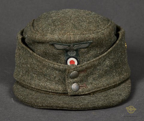 German WWII M43 Field Cap for Mountain Troops-This is a very good example. This is made of a rough textured green wool has a double button closure at the front. The buttons have lost the majority of their finish, except what remains in the lowest details of the pebbling. The machine applied, machine embroidered eagle and cockade are absolutely original to the cap. This was made for issue to mountain troops as it has the zinc edelweiss emblem attached to the left side flap. The flower is gorgeous, it retains both the silver finish, and the yellow/gold stamen in the center. This is excellent. The off green wool lining has very light contract information. It reads Alfred Valet Matzenfabrik, Stuttgart β Bad Canstall.It is nicely dated 1942. It is also stamped as a size 56.The inside green rayon lining show wear and slight pulls to the fabric but this appears to be from normal wear and use, please see photos. Overall, this is a very good offering.