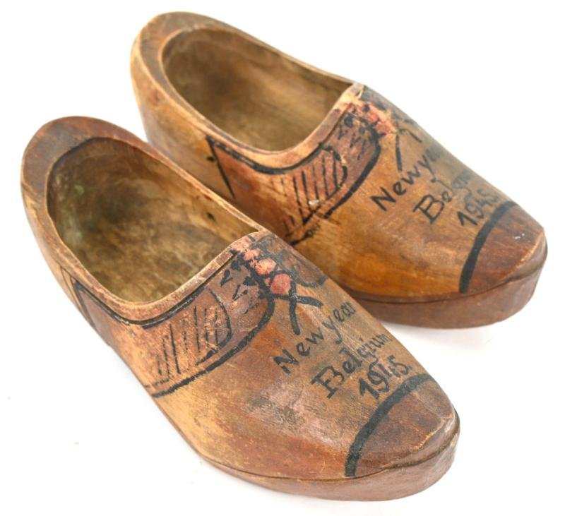 In a very nice condition a matching set of Belgian made wooden shoes.The shoes are found in the USA and a clear veteran bring back.Nicely marked on top 'New Year Belgium 1945'.