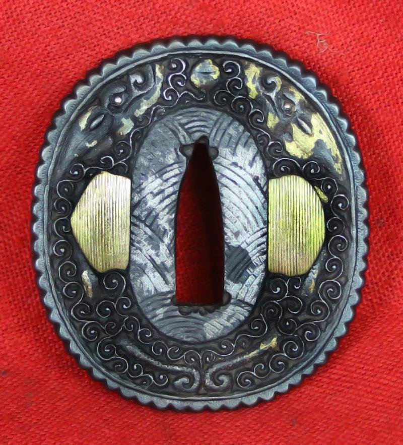An unusual nanban tsuba of unknown origin. It is decorated in a style that reminds of some sawasa export wares. Both sides are carved with two sky dragons over a carved background of scrollwork. The reverse is carved to match, also with two dragon around the infilled hitsu-ana, and the kozuka-hitsu-ana with gold alloy, one domed the other conical. The scrolling, is in the form of an intricately carved cloud background. The rim is beaded. The seppa dai is carved with arked comb pattern overlaid in silver.The fineness of carving and the fact that much of the overlay is done over a cross hatched background that is cut in three directions suggests the work is most likely done in Japan. Our thoughts are that it goes towards the nanban-style carvers in Yamashiro.Nanban tsuba (Southern Barbarian sword guards) are 16th to 19th-century Japanese sword fittings characterized by foreign, non-traditional designs, primarily featuring intricate iron openwork (sukashi), beaded rims, and Chinese or European motifs. Originating from trade with foreign ships, these often-lavish guards were produced in China or by the Dutch East India Company and adapted for Japanese swords.: 'Nanban' means 'Southern Barbarian,' a term used during the Edo period to describe foreigners—specifically Portuguese, Spanish, and Dutch traders—who arrived by sea.While the name implies Western influence, most designs actually show strong Chinese influence.They are usually made of iron, featuring complex openwork (carved in relief or pierced), undercutting, and often feature 'small balls' trapped in small compartments that can move. Common motifs include dragons chasing flaming pearls, foreign letters (like 'VOC' for the Dutch East India Company), and arabesque designs.Initial pieces were likely imported from China or Southeast Asia through Nagasaki from the late 16th century onwards.Japanese craftsmen began copying these styles. They often added specific features for Japanese swords, such as the hitsu-ana (holes for the utility knife/hairpin) and modifying the nakago-ana (tang hole).The Yagami School: Based in Nagasaki, this school specialized in this style during the 18th century, famous for intricate ironwork featuring Chinese-style dragons and, notably, '1000 monkey' designs.Although foreign-influenced, they were popular among samurai as fashionable, often heavily gilded or inlaid with gold/silver. They were sometimes used to subtly showcase hidden religious preferences (e.g., small crosses) during the prohibition of ChristianityNanban-style carvers in Yamashiro (modern-day Kyoto) refers to 18th-century Japanese metalworkers, specifically tsuba (sword guard) makers, who adopted foreign design elements—primarily Chinese, but also Portuguese and Dutch influences—into their craft.These artisans are known for producing Nanban Tsuba (Southern Barbarian sword guards), which often feature intricate, openwork (sukashi) designs, such as dragons, vines, and lion-like figures, usually on an iron ground.They utilized gold or silver nunome-zōgan (inlay) to highlight designs, frequently carving on a cross-hatched background to create a textured, luxurious, or exotic look.While Nanban-style items were often associated with Nagasaki, Kyoto-based makers (Yamashiro) were known for producing higher-quality, more sophisticated, and detailed versions, often with better-finished carvings.Connection to Heianjo School: Some of these designs are categorized alongside Heianjo-style Tsuba, which were established in Yamashiro and known for combining iron with brass inlays.These carvers operated during the Edo period (1603–1868), with peak production of these refined, domestically made Nanban pieces occurring around the 18th century.