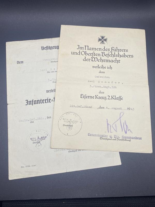 Original pair of citations for the Iron Cross second class and Infantry Assault badge issued to Gefreiten Karl Schäfer of Grenadier Regiment 326. Pair of citations in good shape, some small rips in the central crease of the ISA citation.